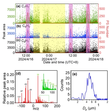结果显示:以91[C7H7+]、104[C8H8+]和115[C9H7+]为示踪离子,可以成功检测到大气环境中具有PSMNP特征的颗粒及其混合状态信息。以广州市实地观测结果为例,结果发现具有PS MNP特征的颗粒占总颗粒(n = 51,045颗粒)的1.04%,主要分布在0.3–0.8 μm粒径范围内,且约76.4%的PS MNPs具有硝酸盐和硫酸盐信号,其中硝酸盐和硫酸盐的相对峰面积占比分别为14.30%和4.06%。