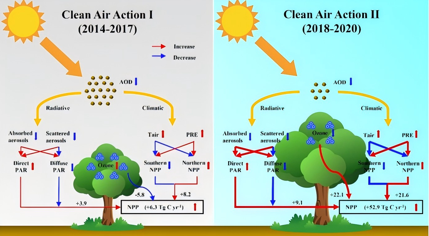 清洁空气行动下气溶胶与臭氧变化对陆地净初级生产力(NPP)的影响机制