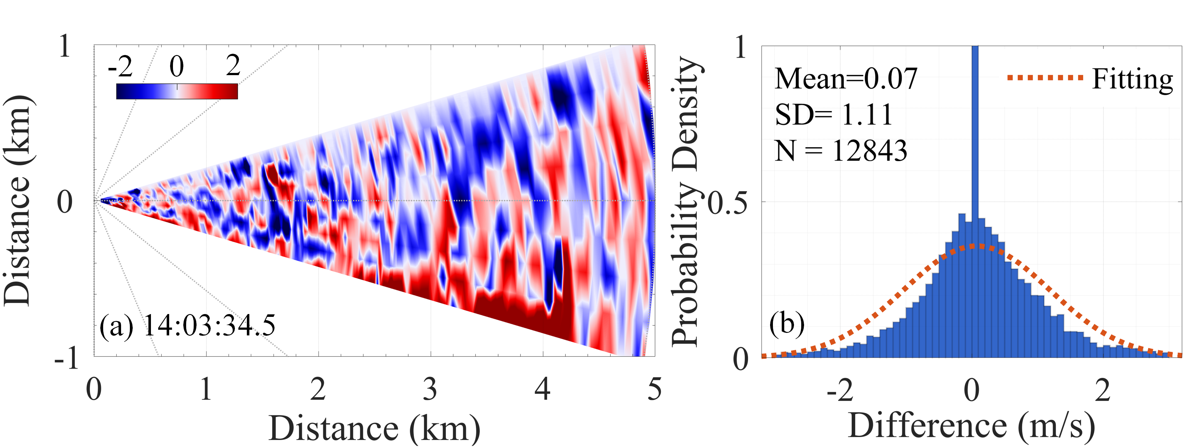 过去,要测量大范围风场,常用的相干多普勒测风激光雷达靠“机械扫描”工作,就像用一束光当 “画笔”,像折扇的辐条一样,一束接一束水平扫过区域,再把这些“辐条”拼合成风场图像。可这个 “扫描” 过程并不快:从第一束光到最后一束光,往往要几秒甚至几分钟。而风不会等设备扫完,前一秒测的某个位置的风速,等扫到下一个位置时,风已经变了。这种“时间滞后”不仅让风场细节抓不准,还会产生巨大误差。图1为瞬态风相机和传统扫描式激光雷达的风场实验数据对比。看似风场结构变化不大,但对图2中全区域风场逐点统计显示:标准偏差达到1.11米/秒,全域平均偏差高达51.2%。若测10米/秒的风,误差能达到5.12 米/秒,容易把“微风”错判成“大风”,甚至漏判、误判阵风、切变风等危害天气现象。