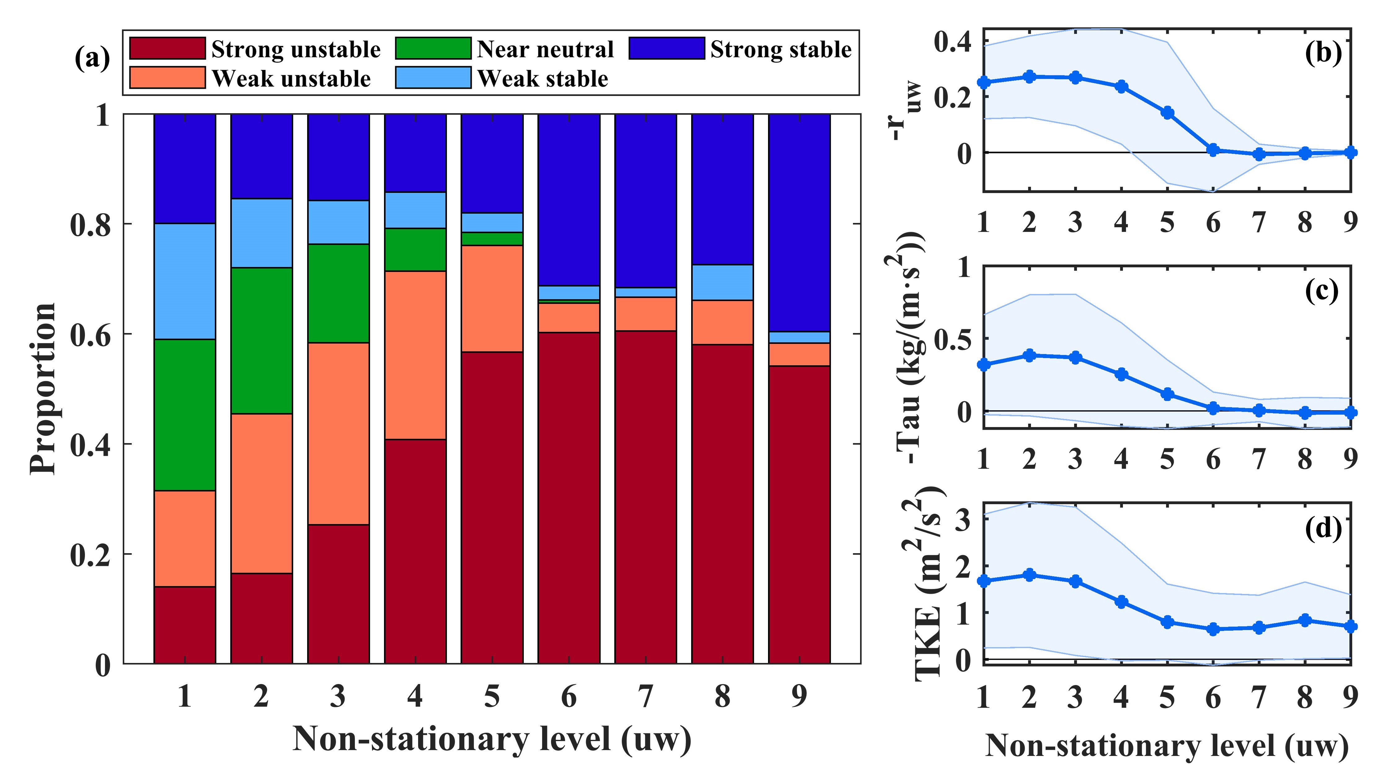 (a)不同非平稳等级下各类大气稳定度的比例;(b)动量传输效率,(c)动量通量,(d)湍流动能随非平稳等级的变化关系。(b-d)中的阴影表示标准差