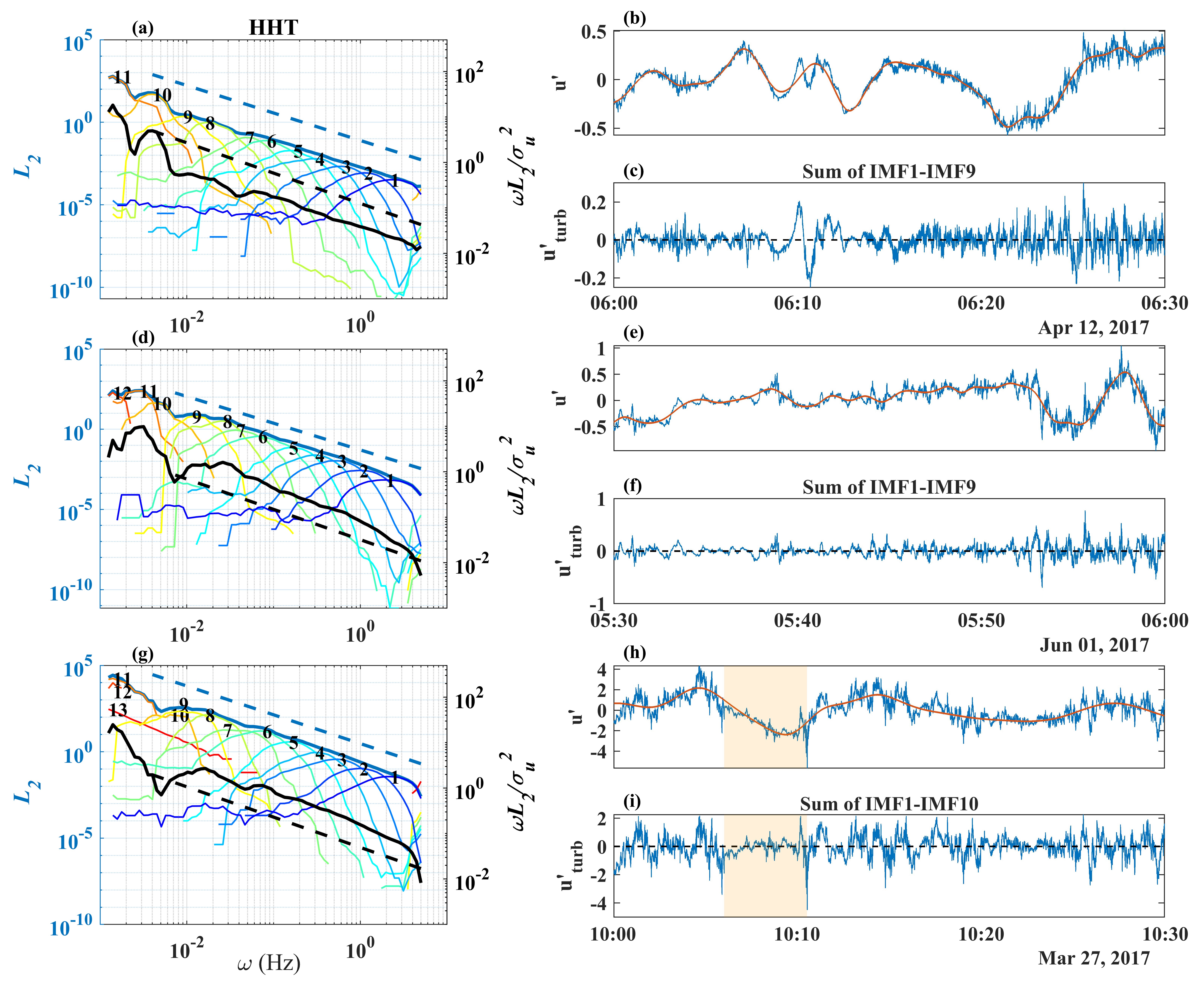 (a,d,g)速度分量u的二阶希尔伯特-黄变换(HHT)谱,左轴表示各本征模态函数的二阶HHT谱(彩色线),右轴表示归一化二阶HHT谱(黑线),蓝色和黑色虚线分别表示-5/3和-2/3参考斜率;(b,e,h)原始脉动量u'(蓝线)与提取的次中尺度运动信号(棕线);(c,f,i)重构的湍流u'(蓝线)时间序列