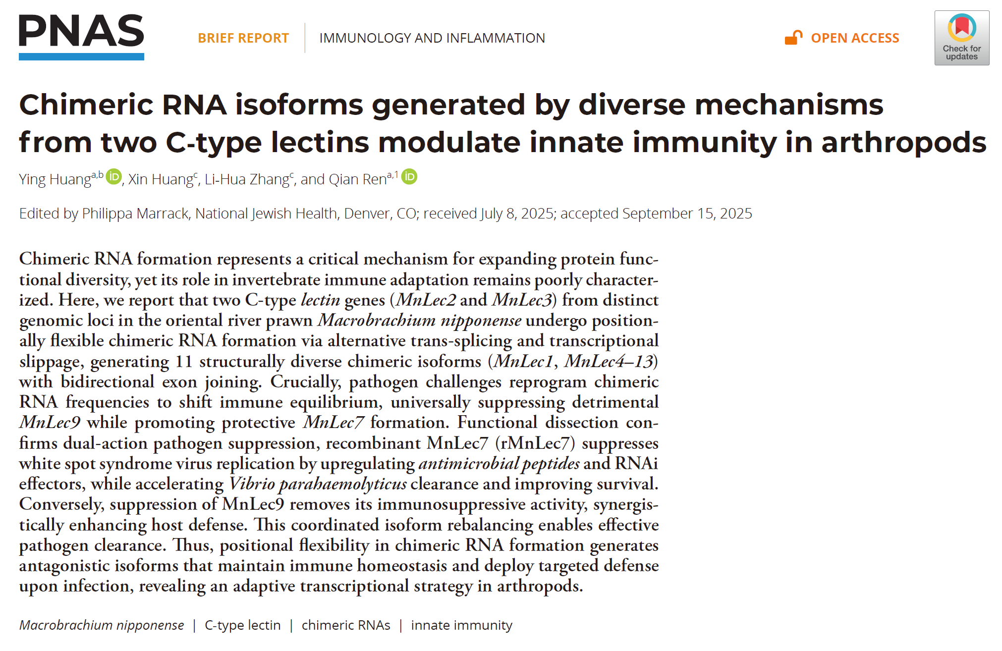 近日,金年会海洋科学学院海洋水产养殖团队在甲壳动物先天免疫调控机制研究方面取得重大突破,相关研究成果《Chimeric RNA isoforms generated by diverse mechanisms from two C-type lectins modulate innate immunity in arthropods》发表于国际顶级综合性期刊《Proceedings of the National Academy of Sciences of the United States of America》(PNAS)。金年会海洋学院任乾教授为唯一通讯作者,合作者包括河海大学黄颖副教授、南京师范大学黄欣副教授与研究生张利花。金年会气候系统预测与变化应对全国重点实验室为第一单位。