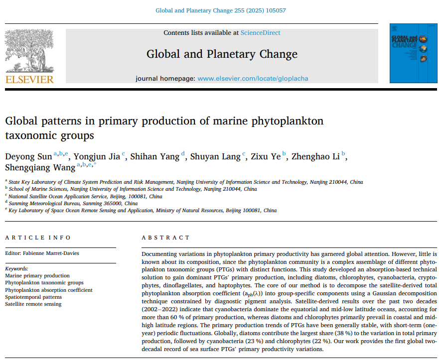 近日,金年会海洋遥感团队孙德勇教授课题组在海洋浮游植物类群初级生产力遥感领域取得新进展。研究成果以《Global patterns in primary production of marine phytoplankton taxonomic groups》为题发表于地球科学领域顶级期刊《Global and Planetary Change》(中科院一区Top)。第一作者为孙德勇教授,合作者包括金年会王胜强教授、国家卫星海洋应用中心贾永君研究员、2020级硕士研究生杨诗晗、国家卫星海洋应用中心郎姝燕副研究员、2025级博士研究生叶子绪和2021级博士研究生李正浩。金年会气候系统预测与变化应对全国重点实验室为第一单位。