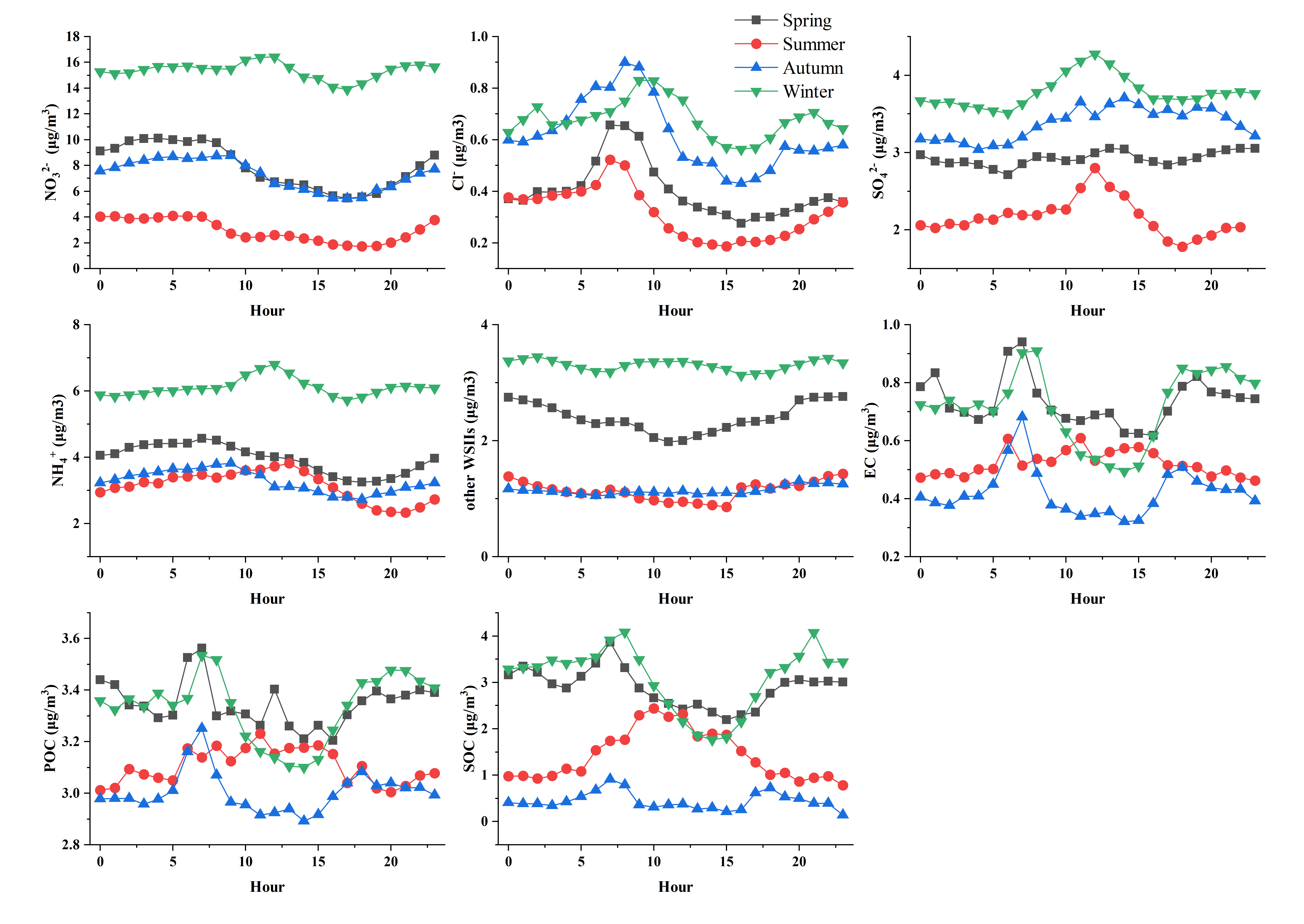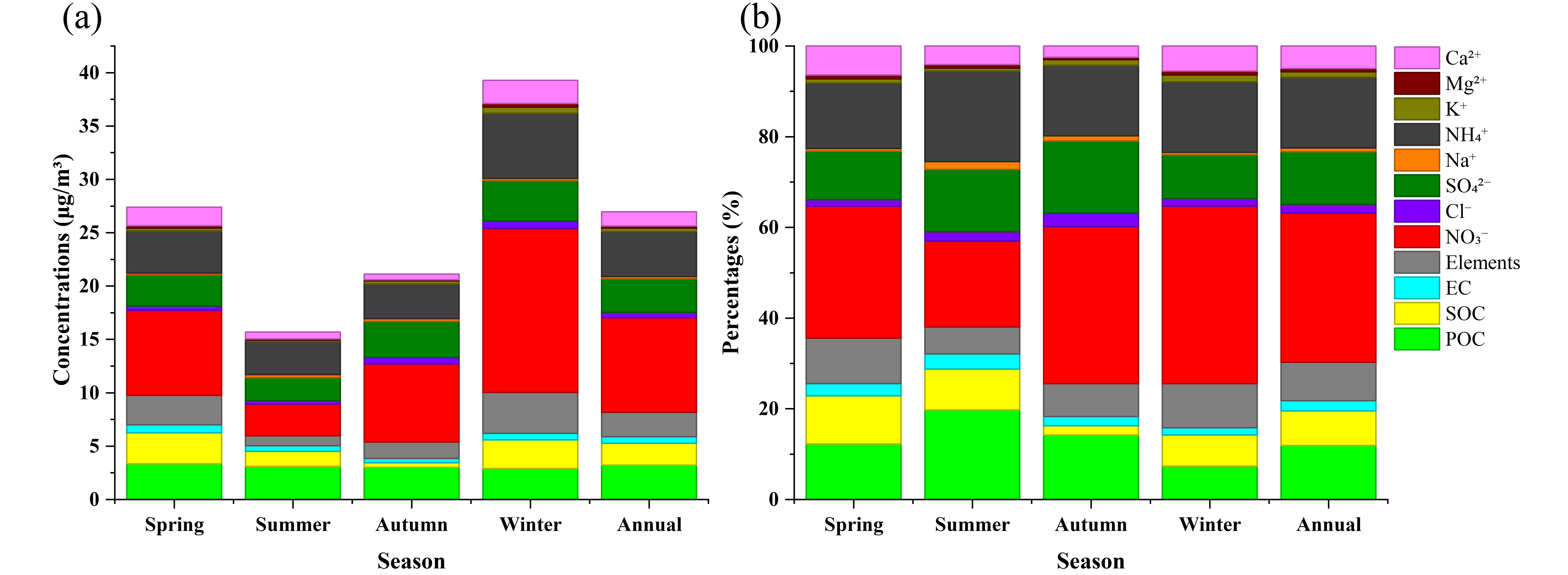 PM2.5作为影响空气质量与公众健康的关键污染物,其化学组成复杂,来源多样。相较于北上广等超大城市,沿海工业城市的高分辨率污染数据长期匮乏,制约了区域性污染的协同治理。这类城市既面临纺织、化工、燃煤电厂等本地工业排放,又叠加日益增长的机动车尾气影响,同时受到海陆交汇气象条件的特殊塑造,污染机制更为复杂。论文基于2024年8月至2025年7月在嘉兴市乌镇超级站开展的一年期连续在线观测数据,综合使用气溶胶化学组分监测仪、元素分析仪、OCEC在线分析仪及气象要素观测系统,综合运用PMF源解析模型与HYSPLIT后向轨迹模型,对PM2.5中水溶性离子、碳质组分、金属元素等进行系统分析。研究发现,嘉兴PM2.5主导组分为:硝酸根离子(32.94%),铵根离子(15.63%)、一次有机碳(11.92%)、硫酸根离子(11.62%)和二次有机碳(7.65%)。