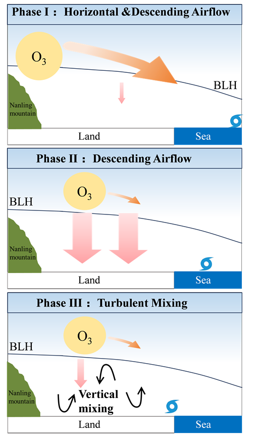 图1 大湾区边界层高度(BLH)内气流和臭氧(O₃)对热带气旋(TC)逼近的动态响应示意图。(a)阶段Ⅰ:水平输送与下沉气流主导——粉色箭头表示来自热带气旋外围的下沉气流,橙色箭头表示将臭氧水平输送至大湾区的东北风。(b)阶段Ⅱ:下沉气流加强。(c)阶段Ⅲ:垂直混合——黑色箭头表示边界层内空气与臭氧的垂直混合过程。