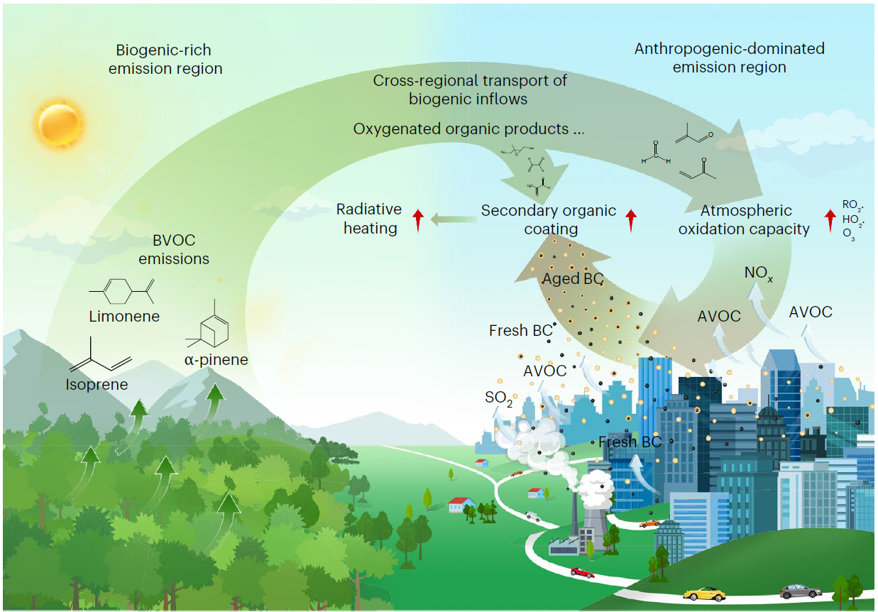 然而,在高人为排放的城市大气环境中,跨区域传输的植物源排放如何影响黑碳包覆物的演化过程及其辐射效应,长期以来缺乏系统的观测与机制研究,这也成为该领域的关键科学难题。针对这一问题,研究团队综合运用外场观测、卫星遥感反演数据及区域大气化学模式模拟等多种研究手段,全面刻画了植被富集区域释放的植物源挥发性有机物,在大气中经氧化生成高氧化态有机产物,再通过区域输送进入下风向城市区域的完整过程。