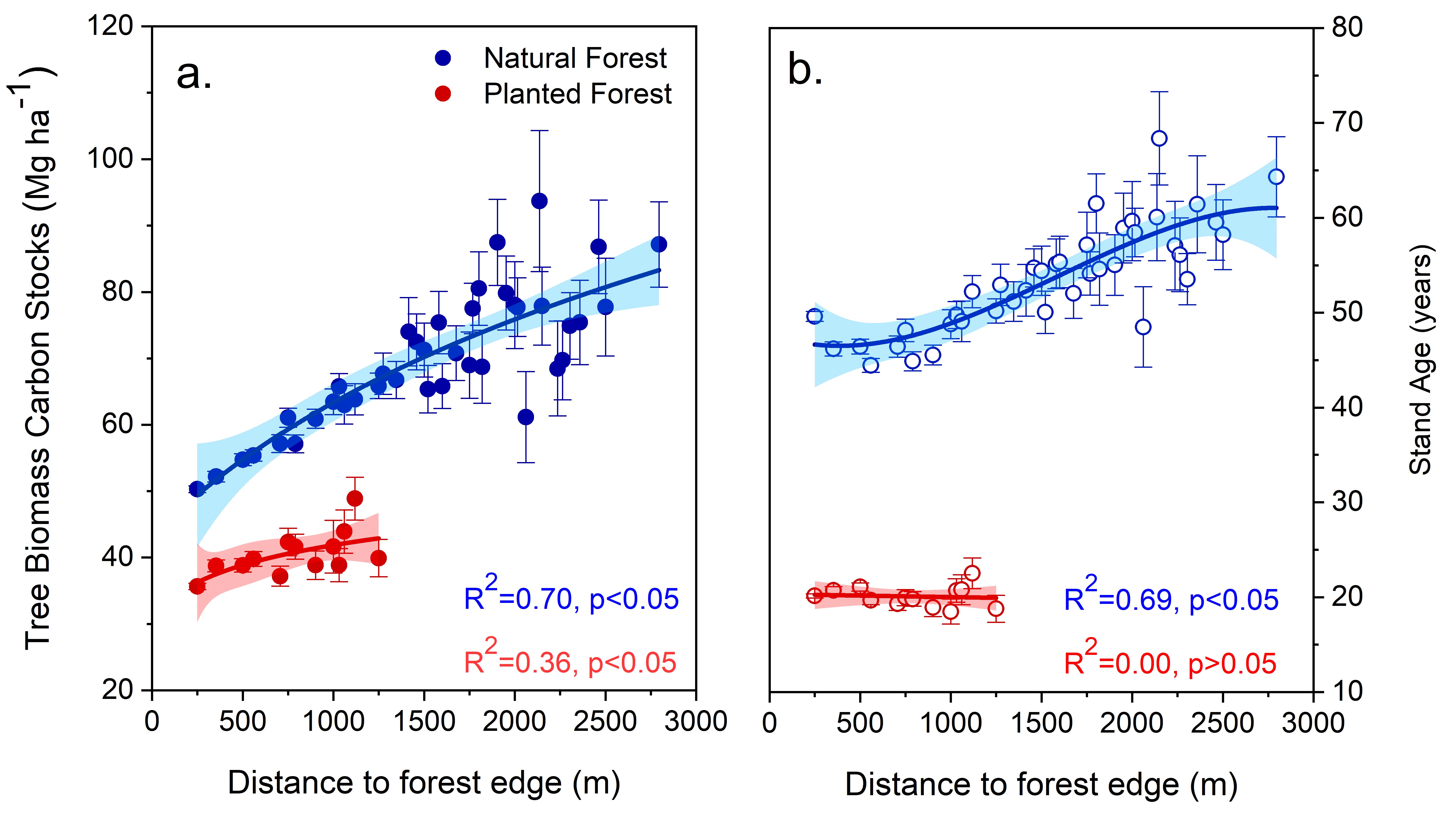 图1. 森林生物量碳储量(a)和林分年龄(b)沿林缘梯度的变化
