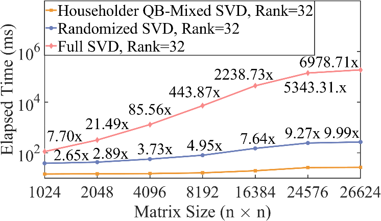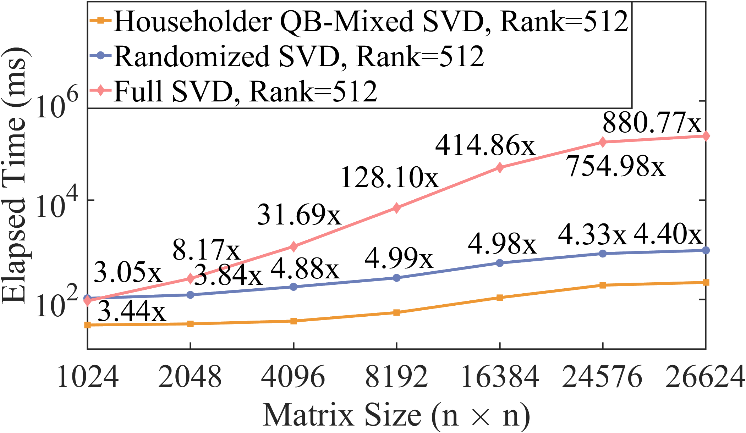 为了解决计算低秩SVD性能低的问题,论文利用了2023年Chen Xu、Weiwei Xu和Kaili Jing发表在National Science Review中的矩阵低秩分解算法-QB算法[1],降低计算低秩矩阵SVD的算法复杂度;再针对Gram–Schmidt正交化过程中精度下降的问题,提出了利用Householder变换部分替代Gram–Schmidt正交化的方法与混合精度方法,使得最终SVD计算的精度(O(1e-07))超过英伟达官方库的SGESVD函数(O(1e-06))。