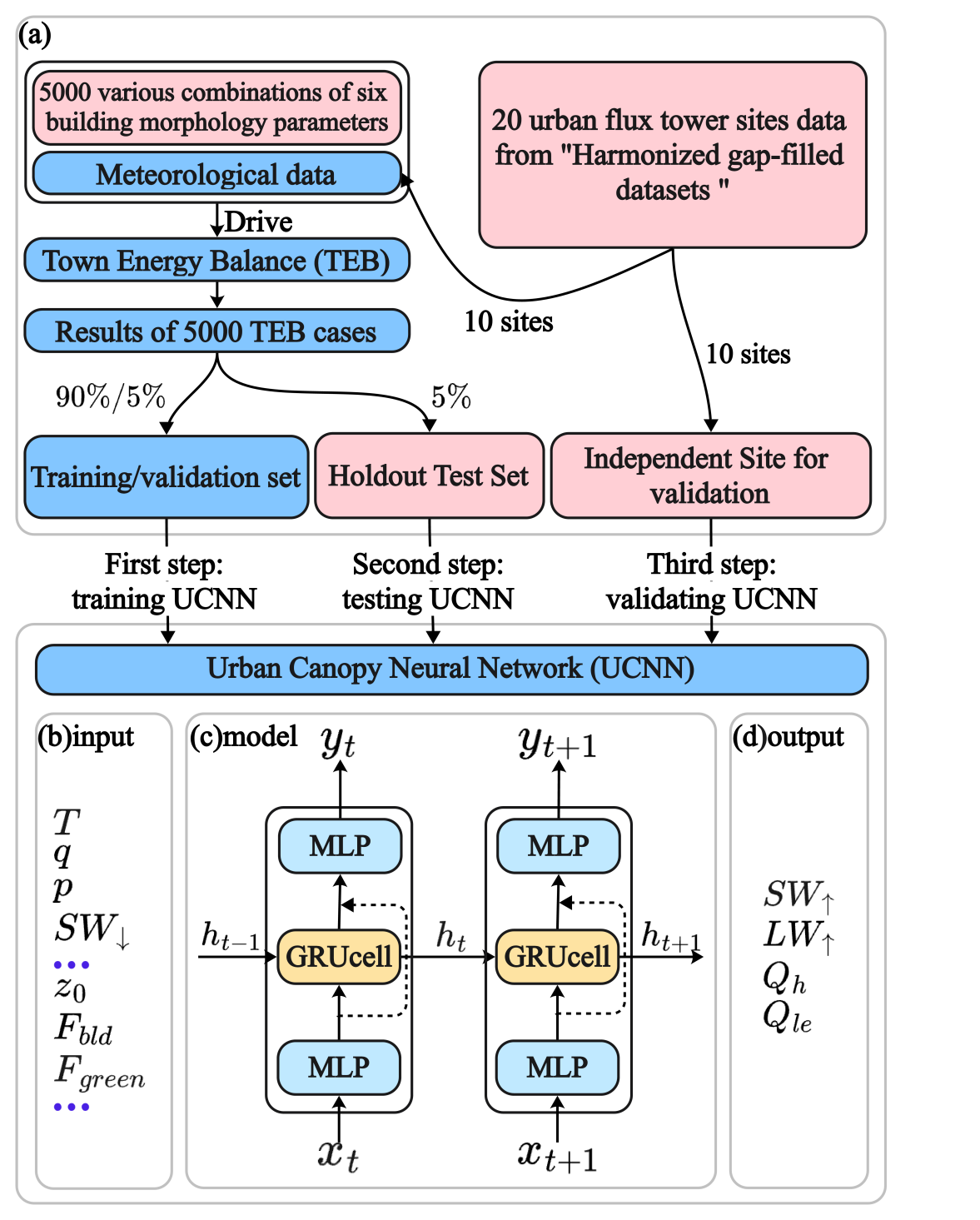 城市冠层模型是天气与气候模式中描述城市下垫面与大气相互作用的重要参数化方案,其性能直接影响城市能量交换、城市热环境以及城市气象预报结果的准确性。然而,传统城市冠层模型通常需要对复杂建筑形态进行简化处理,难以同时兼顾物理过程刻画能力与计算效率。特别是在城市建筑高度、密度、绿地比例等形态参数差异显著的条件下,如何建立兼具普适性、稳定性和高效率的新型城市冠层模型,已成为该领域的重要研究问题。
